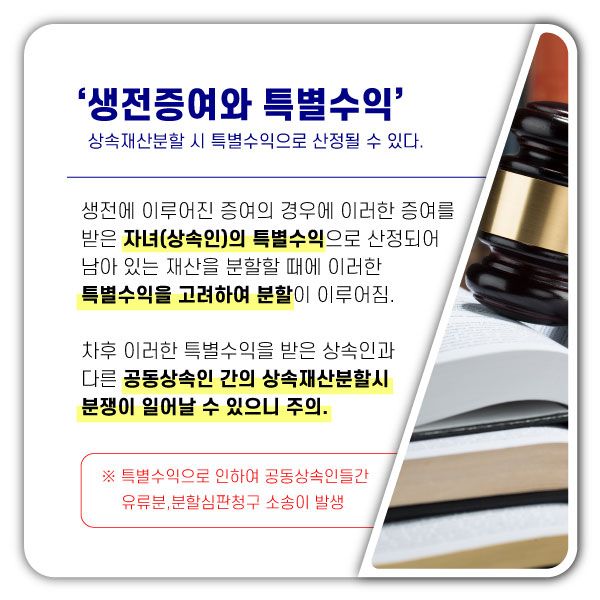 “생전에 증여한 재산은 사후에 증여받은 자녀의 특별수익으로 산정되어 남아 있는 재산을 분할할 때 생전에 증여를 받은 재산을 고려하여 분할이 이루어진다는 점을 충분히 고려하여야 합니다.”