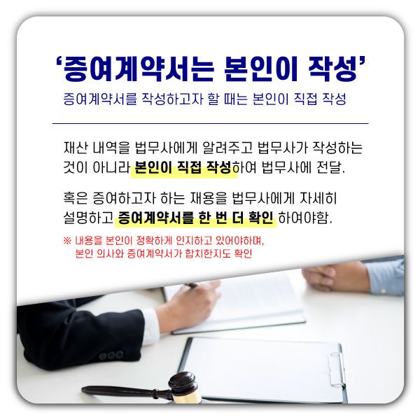 정확하게 진행할 수 있도록 하시는 것을 권하며, 가능하시면 변호사에게 미리 증여계약서를 검토 받으시는 것이 좋습니다.