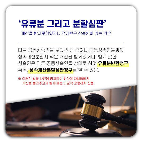 “재산을 증여받지 못한 자녀는 피상속인 사후에 재산을 미리 증여받은 자녀를 상대로 유류분반환청구나 상속재산분할심판청구를 할 수 있다는 점도 충분히 고려하여 재산을 증여하여야 합니다.”