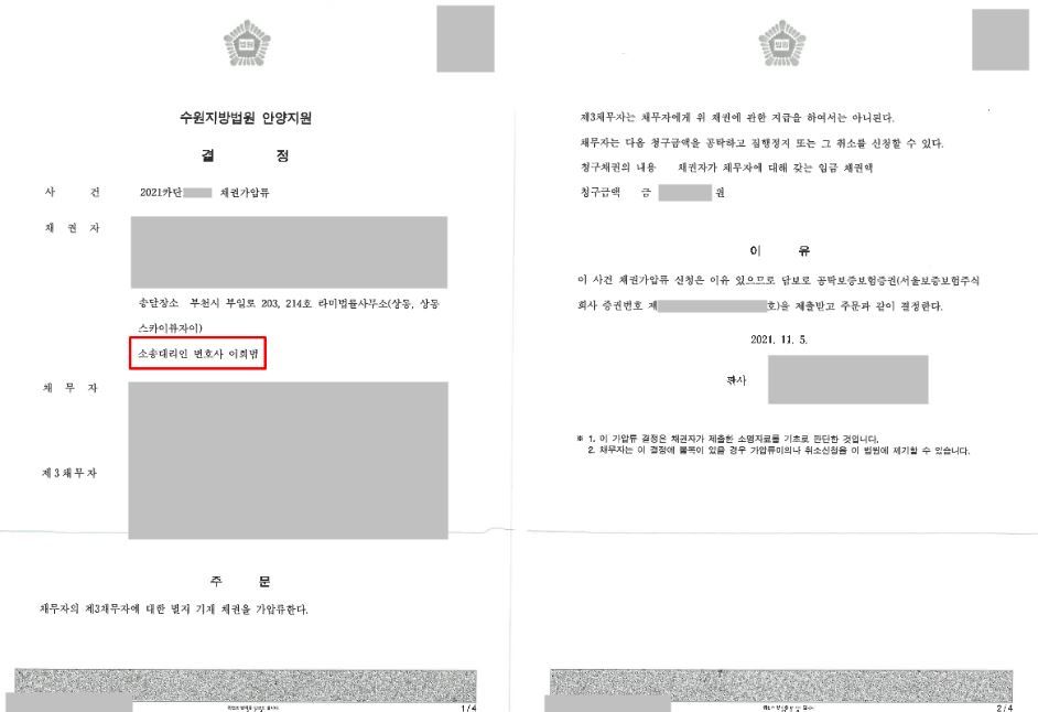저희 사무실에서는 채권 가압류가 필요한 이유를 소명하여 판사를 설득시켰고 이를 채무자 모르게 비밀리에 은밀하게 진행하여 설계 발주 업체에 대한 용역 대금 채권 가압류 결정을 단 이틀만에 얻어낼 수 있었습니다.