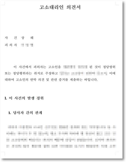 그렇게 무사히 대질조사를 마치고, 대질 신문 내용을 반영한 경찰 단계 의견서도 제출하였습니다. 피고소 혐의가 터무니없다는 부분은 경찰 진술에서 충분히 피력하였으니, 의견서에서는 변호사가 해야 할 법리적인 주장, 즉 B씨의 폭행이 절대 정당방위나 정당행위에 해당하지 않는다는 점을 조목조목 논증하였습니다.