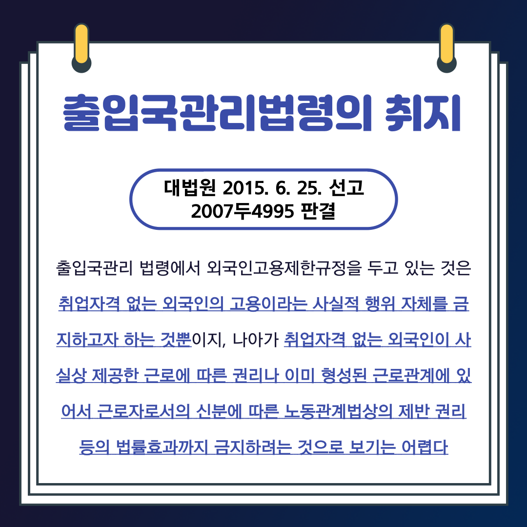 그러나 대법원은, 출입국관리 법령에서 외국인고용제한규정을 두고 있는 것은 취업자격 없는 외국인의 고용이라는 사실적 행위 자체를 금지하고자 하는 것뿐이지, 나아가 취업자격 없는 외국인이 사실상 제공한 근로에 따른 권리나 이미 형성된 근로관계에 있어서 근로자로서의 신분에 따른 노동관계법상의 제반 권리 등의 법률효과까지 금지하려는 것으로 보기는 어렵다고 판시하였습니다.