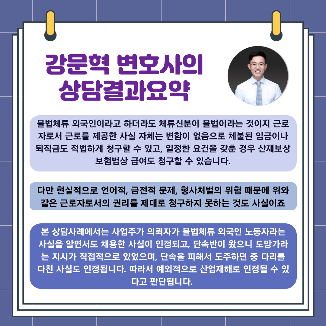 오늘은 불법체류 외국인의 산재처리 관련 상담사례를 소개해 드리겠습니다.