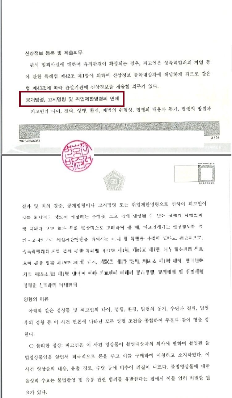검사님은 공판 종결 당시, 의뢰인님에 대한 신상정보 공개.고지 명령 및 장기간의 취업제한명령 등도 구형한 바 있지만 재판장님은 참작사유들을 두루 살펴 위 명령 등을 모두 면제하게 되었습니다.