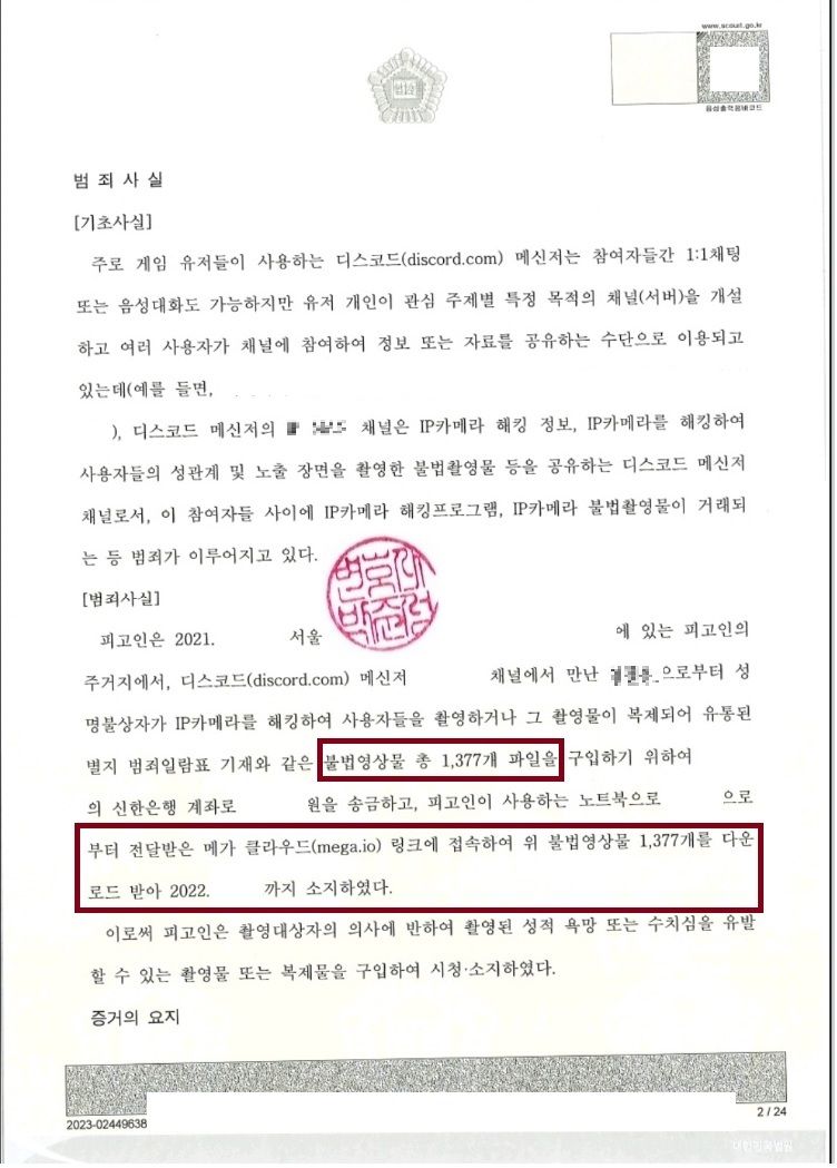 이 사건은 의뢰인님이 디스코드 메신저에서 IP카메라를 해킹하여 촬영된 불법촬영물 총 1,377개를 구입하여 메가클라우드 링크를 건네 받아 다운로드하게 되었고, 그로 인해 경기남부경찰청으로부터 자택 압수.수색을 받아 사건이 시작되었습니다.