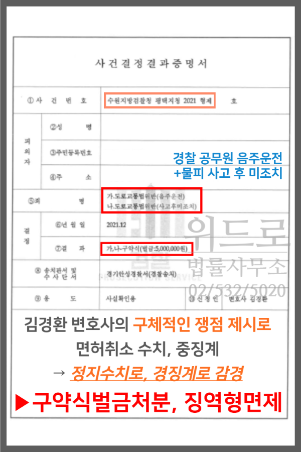 위 사례의 경우 초범이었지만, 취소 수치의 음주운전, 물피사고, 사고후 미조치로 인해 현장을 이탈하였던 점이 중하여 정식재판에 회부될 가능성이 높았음. 그런데, 경찰공무원인 의뢰인의 경우 징역형 이상의 처벌을 받게 되는 경우에는 경찰공무원법상 당연퇴직사유에 해당하여 공무원지위를 잃게 되고, 벌금형을 받더라도 취소 수치의 음주운전으로 처벌받는 경우, 경찰공무원 음주운전 징계양정상 중징계를 받게 되어 있었음.