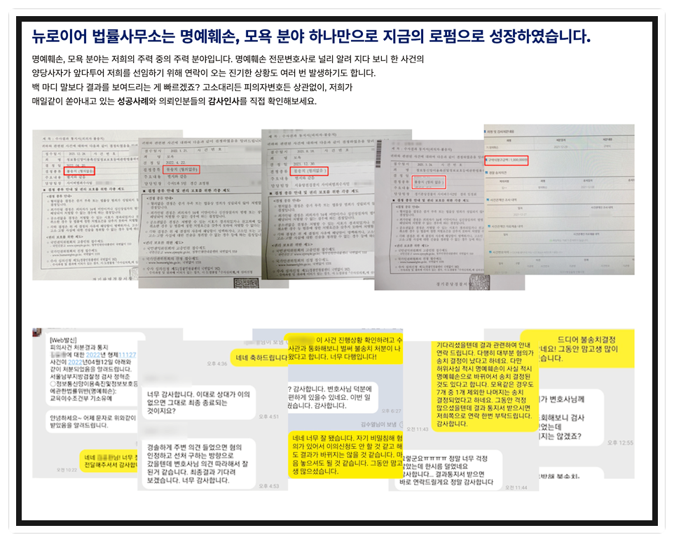 ![[명예훼손/모욕] 고소 대리 노하우 2가지 #단체고소](/_next/image?url=https%3A%2F%2Fd2ai3ajp99ywjy.cloudfront.net%2Fuploads%2Ftitleimage%2Foriginal%2F5baca36f5f21f78739e44508-original.jpg&w=3840&q=75)