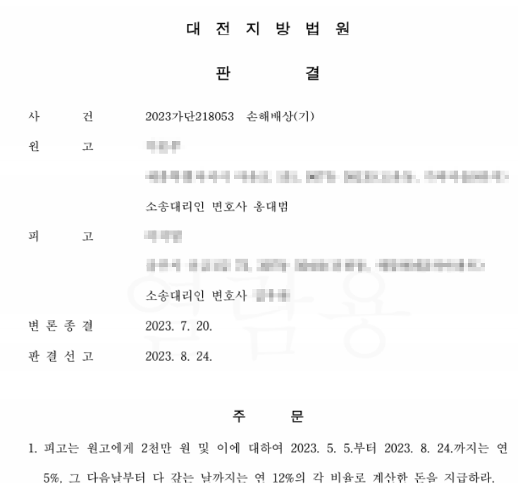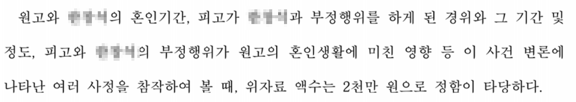 의뢰인이 의뢰인의 남편과 이혼하지 않고 현재도 혼인생활을 유지하고 있다는 점이 참작되어 의뢰인 청구 중 일부가 기각되었으나, 2천만원을 승소하게되었습니다.