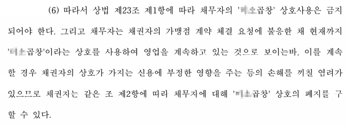 의뢰인은 00곱창이라는 상호로 음식점을 운영하고 있었는데, 돼지껍데기를 팔던 상대방은 장사가 잘 되지 않자 의뢰인으로부터 00곱창의 상호와 운영 노하우를 전수해달라고 하였습니다. 의뢰인은 상대방과 1년 뒤에 상호 대여와 운영 노하우에 대한 대가를 받기로 하고, 일단 무료로 00곱창 상호 사용과 운영 노하우를 상대방에게 전수해주었습니다. 그러나 상대방은 1년 뒤 의뢰인에게 상호 사용 등에 대한 대가를 지불하기 거절하였고, 그러면서도 00곱창이라는 상호는 지속적으로 사용하여 의뢰인의 상호권을 침해하였습니다.