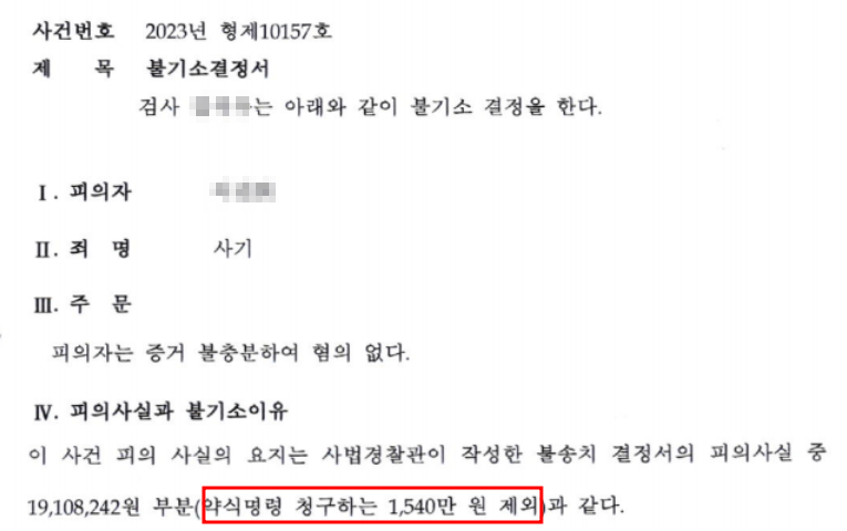 이에 저는 담당 수사관이 한 불송치 이유가 합당하지 않은 이유를 조목조목 설명하여 이의신청을 하였고, 검사가 이를 받아들여주어서 토지구입과 아이 학비 명목으로 의뢰인으로부터 돈을 빌린 것은 사기에 해당한다며 피해액을 1,540만원으로 산정하여 상대방에 대하여 벌금 700만원의 약식명령을 청구하였습니다.