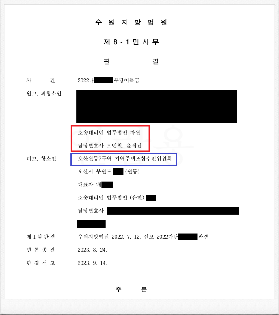 이번에도 재판부는 저의 주장을 받아들여, 제1심에서의 사실인정과 판단은 정당한 것으로 인정됨을 그 이유로 하여, 오산원동7구역 지역주택조합 추진위원회 측의 항소를 기각하였습니다.