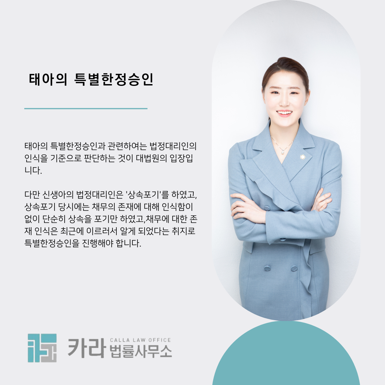 다만 신생아의 법정대리인은 '상속포기'를 하였고, 상속포기 당시에는 채무의 존재에 대해 인식함이 없이 단순히 상속을 포기만 하였고,채무에 대한 존재 인식은 최근에 이르러서 알게 되었다는 취지로 특별한정승인을 진행해야 합니다.