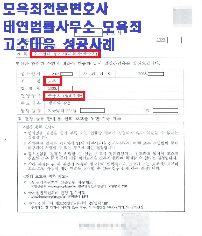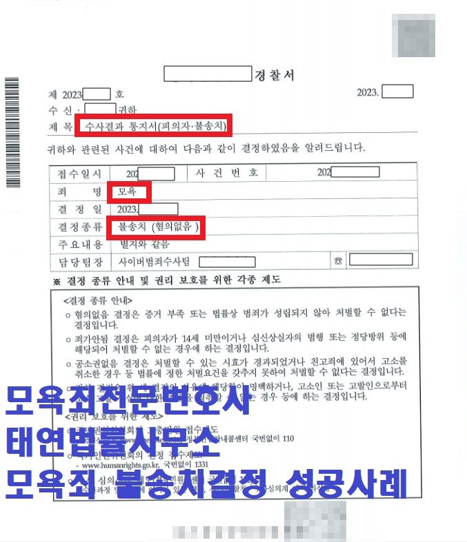 그렇기에 가장 중요한 것은 사건 진행 경험과 성공 사례를 다수 보유한 모욕죄변호사, 모욕죄전문변호사의 조력을 받는 것입니다. 위 사례의 의뢰인처럼 불송치결정 수령을 위해서는 발빠른 대응전략 구상, 효과적이며 논리적인 법적 대응이 가장 중요합니다. 만약 해당 사례의 의뢰인과 같은 사안에 고민하고 계시다면 저희 태연법률사무소의 변호사님과 상담 진행해보시기를 추천드립니다.