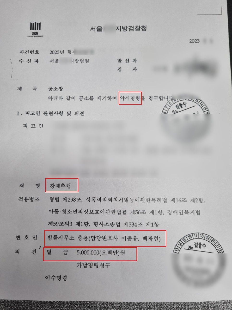 검찰은 이 사건 강제추행에 대하여 구공판 청구를 하지 않고 약식 500만 원 벌금형 기소를 하였습니다.