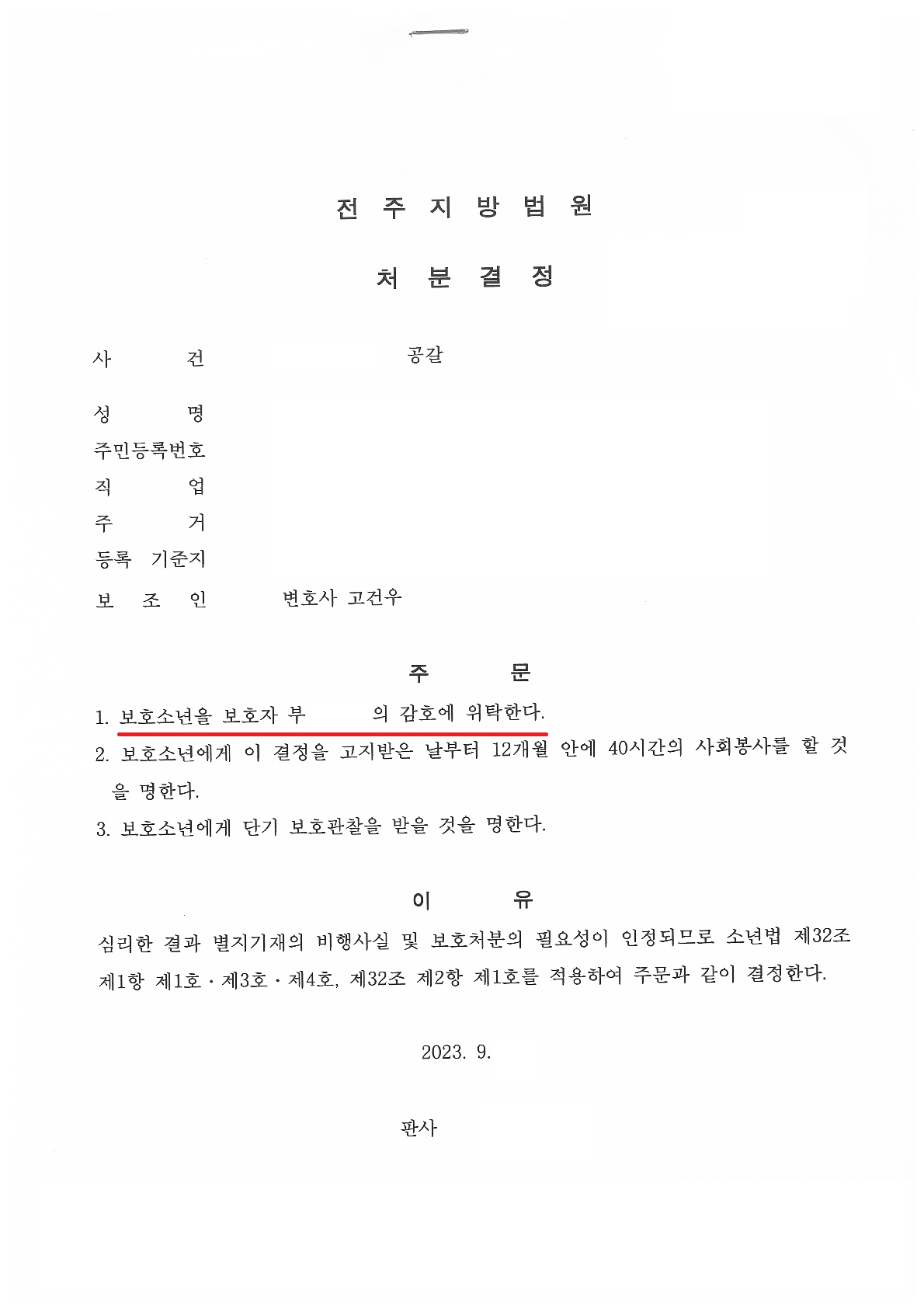 이에 본 변호사(보조인)은 피해자들과의 합의를 이끌어 내고 보호소년의 교화가능성 등 기타 정상자료를 통한 선처를 호소하여 방어하였고,