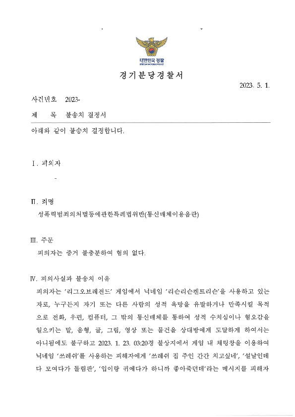 결론적으로 게임 통매음은 위 두가지 유형 모두 무혐의주장이 가능 합니다. 특히나 첫번째 성적 패드립 유형이 무혐의처분을 받기에 더욱 쉽고, 두번째 유형조차도 무혐의처분을 받는 것이 그리 어렵지 않습니다.