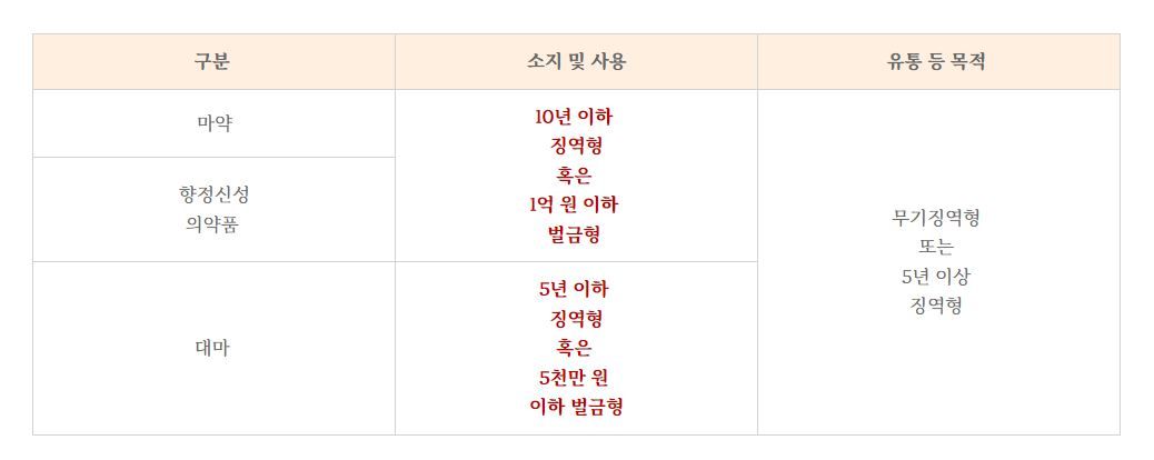 우선 아래 마약, 향정신성의약품, 대마로 구분하여 처벌 수위부터 정리해 드리겠습니다.