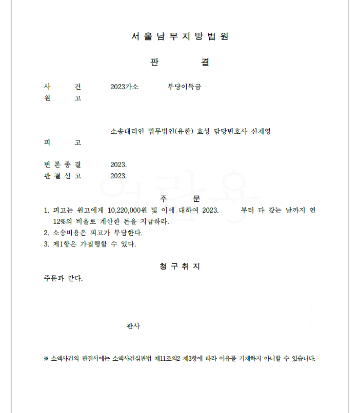 저는 즉각 입금 받은 자를 피고로 하여 민사소송 부당이득반환청구소송을 제기하였고 법원은 원고 승소 판결을 선고하여 의뢰인은 피해액을 반환받게 되었습니다.