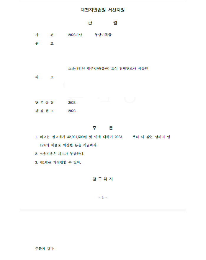 저는 즉각 입금 받은 자를 피고로 하여 민사소송 부당이득반환청구소송을 제기하였고 법원은 원고 승소 판결을 선고하여 의뢰인은 피해액을 반환받게 되었습니다.