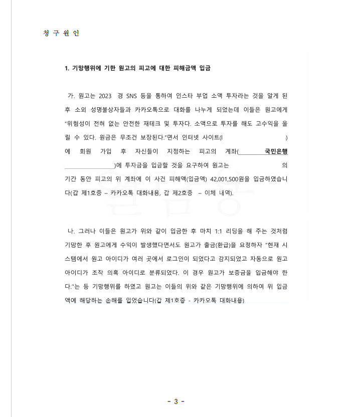 이 사건에서도 의뢰인은 투자 사기를 당하여 피고에게 피해액을 입금하였고 이를 돌려받기 위해 저를 찾아오셨습니다.
