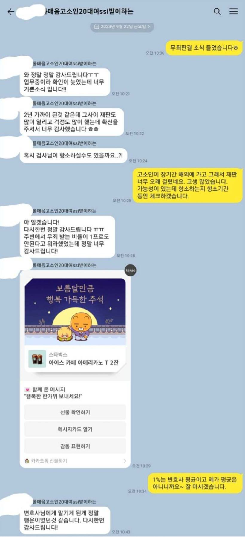 이 사안은 1심에서 받은 유죄판결을 파기하고 무죄판결을 선고하는 것이라 판결문도 8장이나 되고 무죄 이유의 설시도 상당히 내용이 많고 구체적이었습니다. 1심에서 유죄판결을 받은 경우 항소심은 사실상 마지막 기회이기 때문에 의뢰인이 불안하게 생각하여 입장을 번복하는 경우가 종종 있습니다. 저를 믿고 신뢰를 보여주었기 때문에 더 열심히 변호할 수 있었고 좋은 결과를 얻을 수 있었던 것 같습니다.