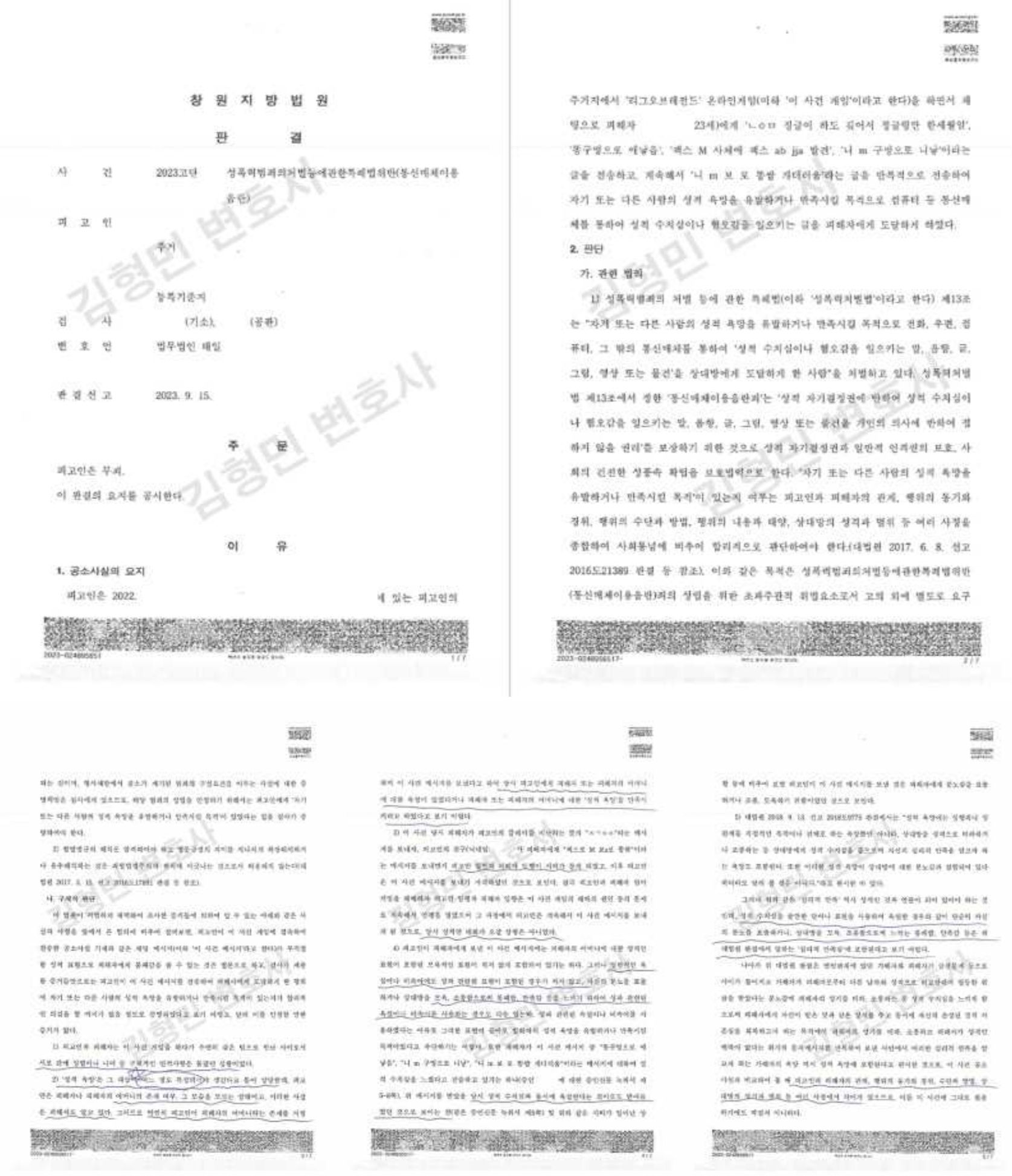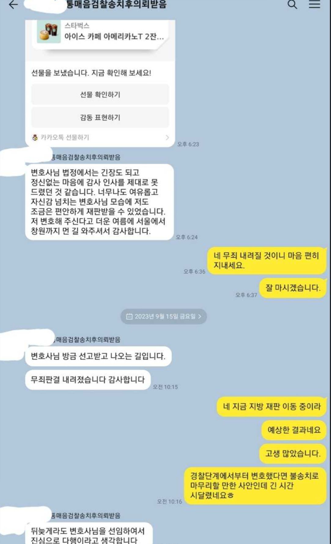 이 사안은 누구에게 한 채팅인지부터 다투어졌고 고소인이 장기간 해외에 가기도 하였기 때문에 재판이 계속 지연되었습니다. 일부 채팅은 고소인에게 한 것이 아니라는 것이 받아들여져 공소장 변경이 있기도 하였습니다. 재판 진행 과정에서는 불리하게 판단하고 있는 것 같다는 의뢰인의 하소연도 있었고 실제 불리한 심증을 비춘 것 같다는 인상을 받은 것도 사실입니다. 항소심이 있어 다 밝힐 수는 없으나 1심 재판 과정에서 이루어진 것만으로는 한 가지가 빠져 있어 절대 유죄판결이 나올 수 없다는 확신이 있었기 때문에 제 나름대로는 안심하고 있었습니다. 마지막 기일에서 판사님의 태도로 짐작컨대 아마도 제가 변론요지서를 제출한 이후 판결문을 쓰기 전에 결론이 바뀌지 않았나 싶습니다.