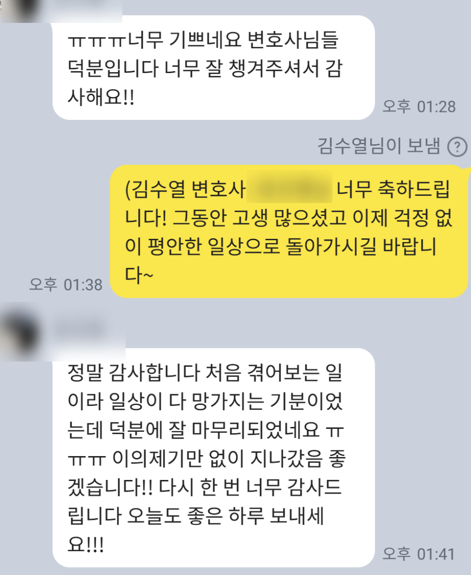 결국, 검찰 측은 저희가 의견서에 주장한 내용을 바탕으로 '무혐의' 처분을 하였고, 의뢰인분은 결과를 받으시고 너무나도 기뻐하셨습니다.