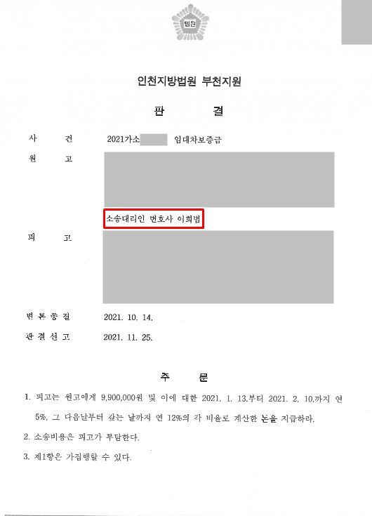 의뢰인(원고)의 소송제기 1년 만에 원고의 청구가 모두 인용되면서 전부 승소하여 의뢰인의 임대차 보증금을 전액 돌려받을 수 있었습니다.