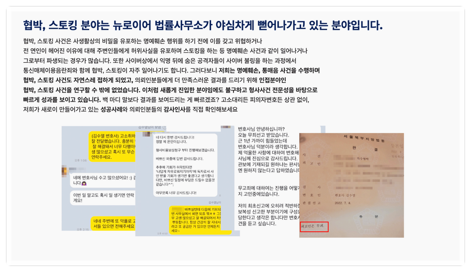 피해자의 입장을 누구보다 잘 알고 있기에 저희는 협박, 카찰죄 사건에 있어서는