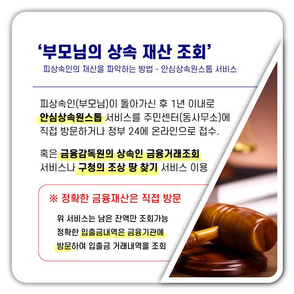 또한 금융감독원의 상속인 금융거래조회 서비스, 구청의 조상 땅 찾기 서비스 등을 이용할 수도 있습니다.