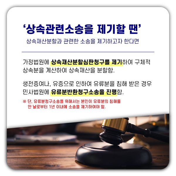 또한 피상속인의 재산을 일부 공동상속인들이 피상속인 생전에 전부 또는 일부를 증여 등을 통하여 미리 받았고, 해외 거주자가 분할 받을 재산이 남아 있지 않거나 유류분보다 더 적을 경우 해당 관할 민사법원에 유류분반환청구소송을 할 수 있습니다.