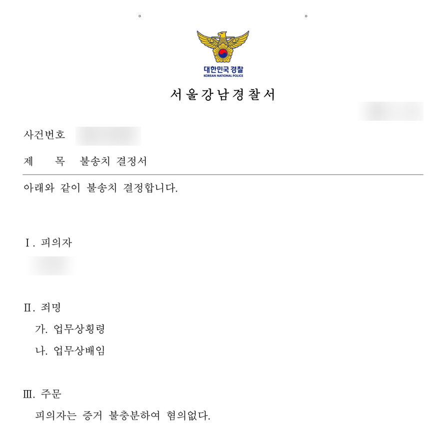 경찰은 법률사무소 리온의 적극적인 변호를 받아들여 본 사건에 대하여 '불송치'를 결정하였습니다.