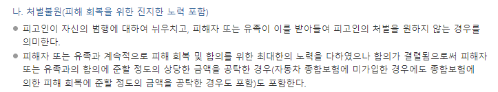 위 양형기준표에서는 처벌불원 및 피해 회복을 위한 진지한 노력을 "감형상 특별양형인자"로서 고려하고 있습니다.
