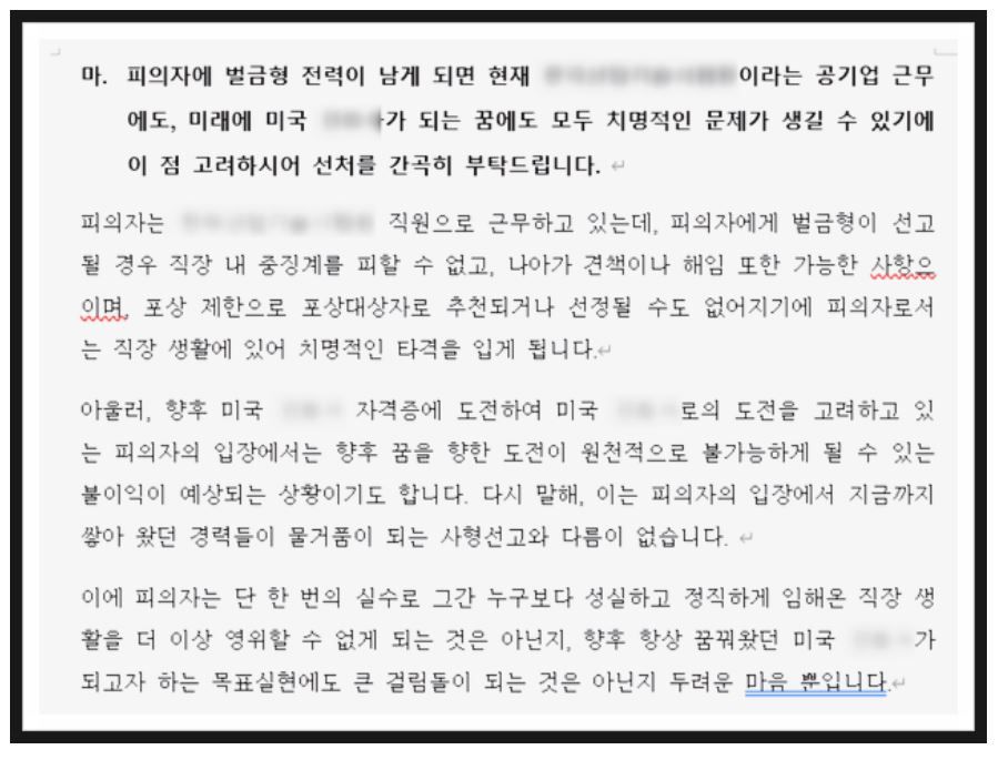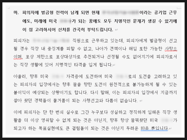 개개인 상황에 맞는 정상관계를 발굴하여 선처를 이끌 전략을 모색하는 것이 다소 어려우실 거라 생각합니다.