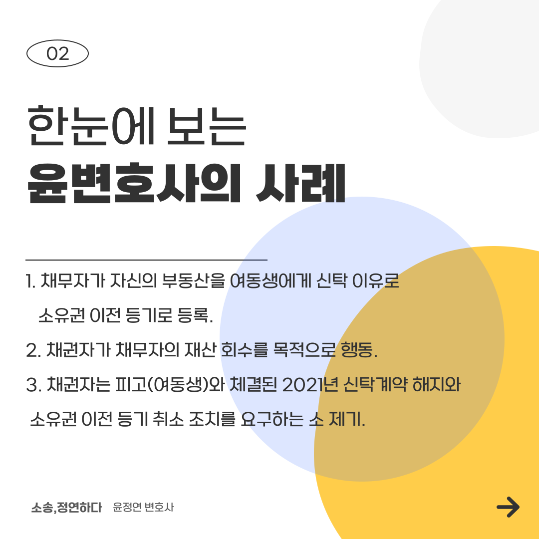 제가 진행한 사례에서는 채무자가 자신의 유일한 부동산을 자신의 여동생에게 신탁을 이유로 하여 소유권 이전 등기를 등록한 경우입니다. 이러한 상황에서 채권자는 먼저 채무자의 재산을 회수하고자 했습니다.
