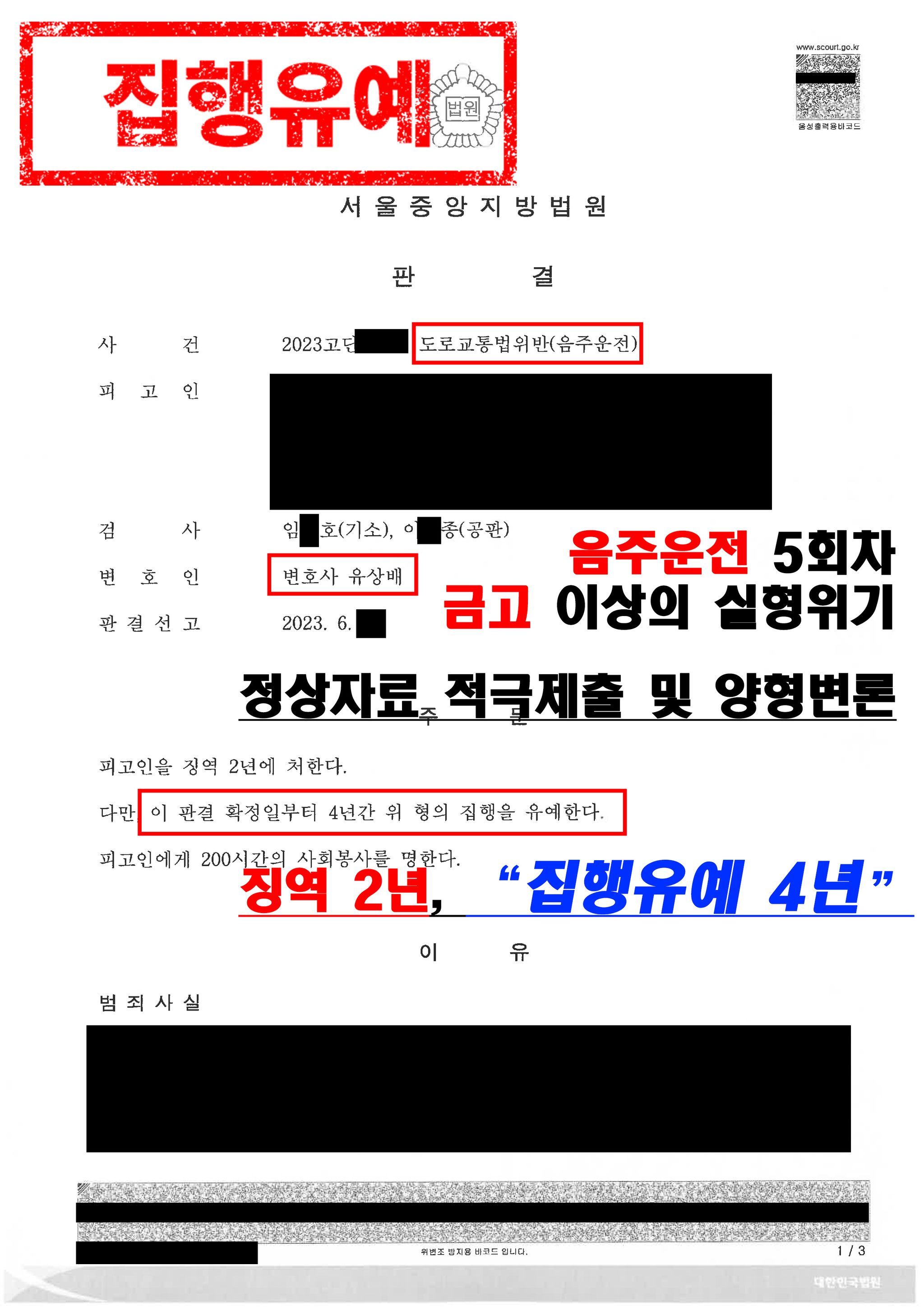 본 변호인은 공판기일에서 재판부에 의뢰인의 반성의 정도, 재범방지를 위한 노력, 음주경위 중 참작할 부분, 등 여러 정상참작자료들을 제출하면서 양형변론을 한 결과, 다행히도 실형이 선고되지 않고 징역 2년, 집행유예 4년을 선고하였습니다.