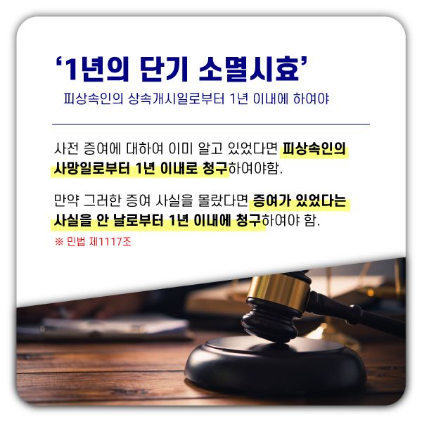 즉, 『사망사실』, 『증여사실』 둘 다 알게 된 날로부터 1년 내에 해야 한다고 생각하시면 쉽게 이해하실 수 있습니다.
