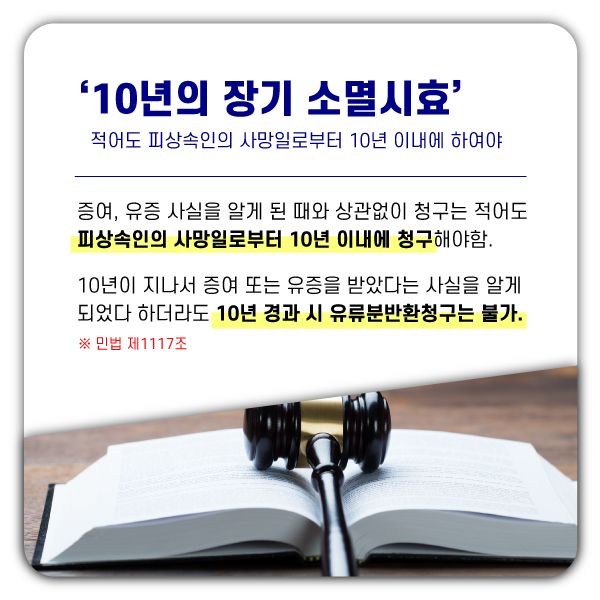 유류분반환청구권의 소멸시효에 대하여 민법 제1117조는 “반환의 청구권은 유류분권리자가 상속의 개시와 반환하여야 할 증여 또는 유증을 한 사실을 안 때로부터 1년 내에 하지 아니하면 시효에 의하여 소멸한다. 상속이 개시한 때로부터 10년을 경과한 때도 같다."라고 규정하고 있습니다.