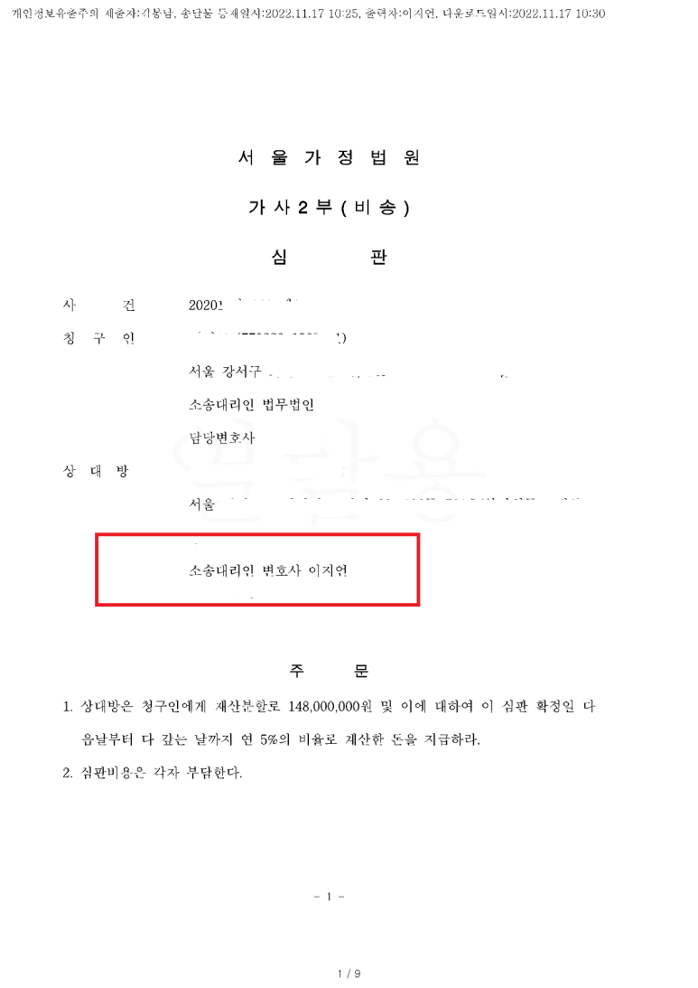 그 와중에 의뢰인은 탁월한 투자능력을 발휘하여 물론 대출이 있기는 하였으나 서울 내 14억이 넘는 아파트를 보유하고 있었고, 배우자는 혼인생활 동안 생활비를 준 적도 없음에도 이혼한 마당에 재산분할이라도 받고자 하는 못된 심보로 5억 원이 넘는 재산분할청구를 하였던 것입니다.