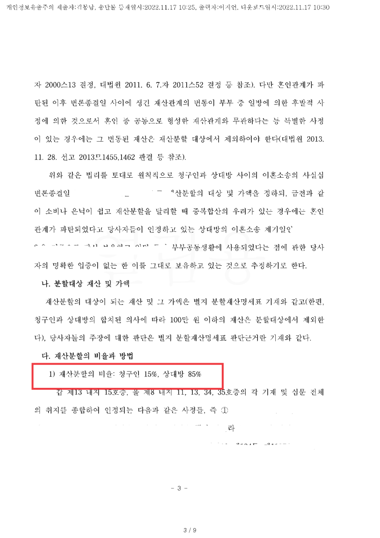 결국, 재판부에서도 저의 위와 같은 주장들을 받아들여 아래와 같이 재산분할 기여도 85 : 15 라는 매우 놀라운 재산분할 비율을 인정해 주었습니다. 상식이 통한 결과였습니다. 의뢰인은 배우자에게 지급해야 할 재산분할금액을 최소화할 수 있었고 상당히 만족해 하였습니다.