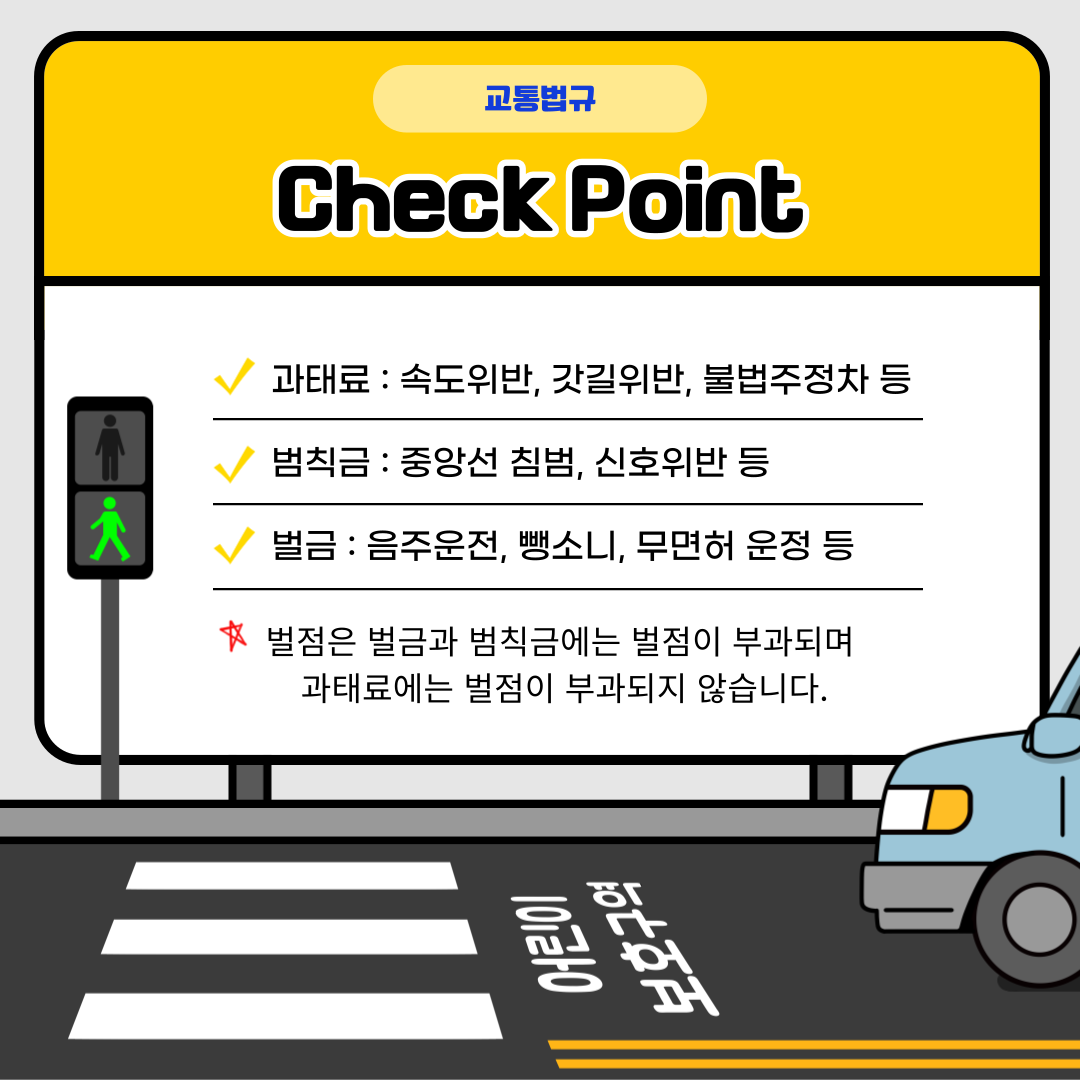 이렇게 과태료, 범칙금, 벌금, 그리고 벌점에 대해 자세히 살펴보았습니다. 이러한 제재들은 교통법규를 위반한 행위에 대한 다양한 형태의 경제적이거나 법적인 제재입니다. 각각의 제재는 그 목적과 특징에서 차이가 있으며, 교통규칙을 어기면 발생하는 다양한 상황에서 적용됩니다.