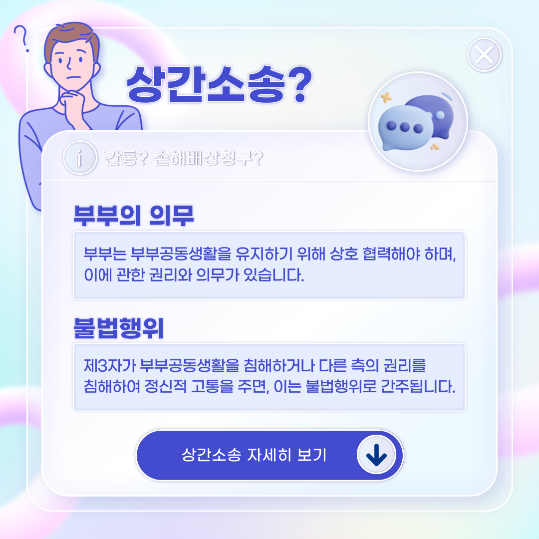 상간소송은 혼인 생활 중에 발생하는 간통행위와 관련된 법적 분쟁을 해결하는 절차로, 혼인과 가정의 안정성을 보호하고 법률적으로 처리하는 중요한 과정입니다. 혼인은 사회적으로 중요한 제도로 인정되며, 이를 침해하는 행위에 대한 법적 대응이 필요합니다. 이 글에서는 상간소송에 대한 이해와 주요 내용을 나눠보겠습니다. 상간 소송이란 무엇이며, 어떻게 진행되는지에 대한 정보를 통해 법적 절차와 권리를 더 잘 이해할 수 있을 것입니다.