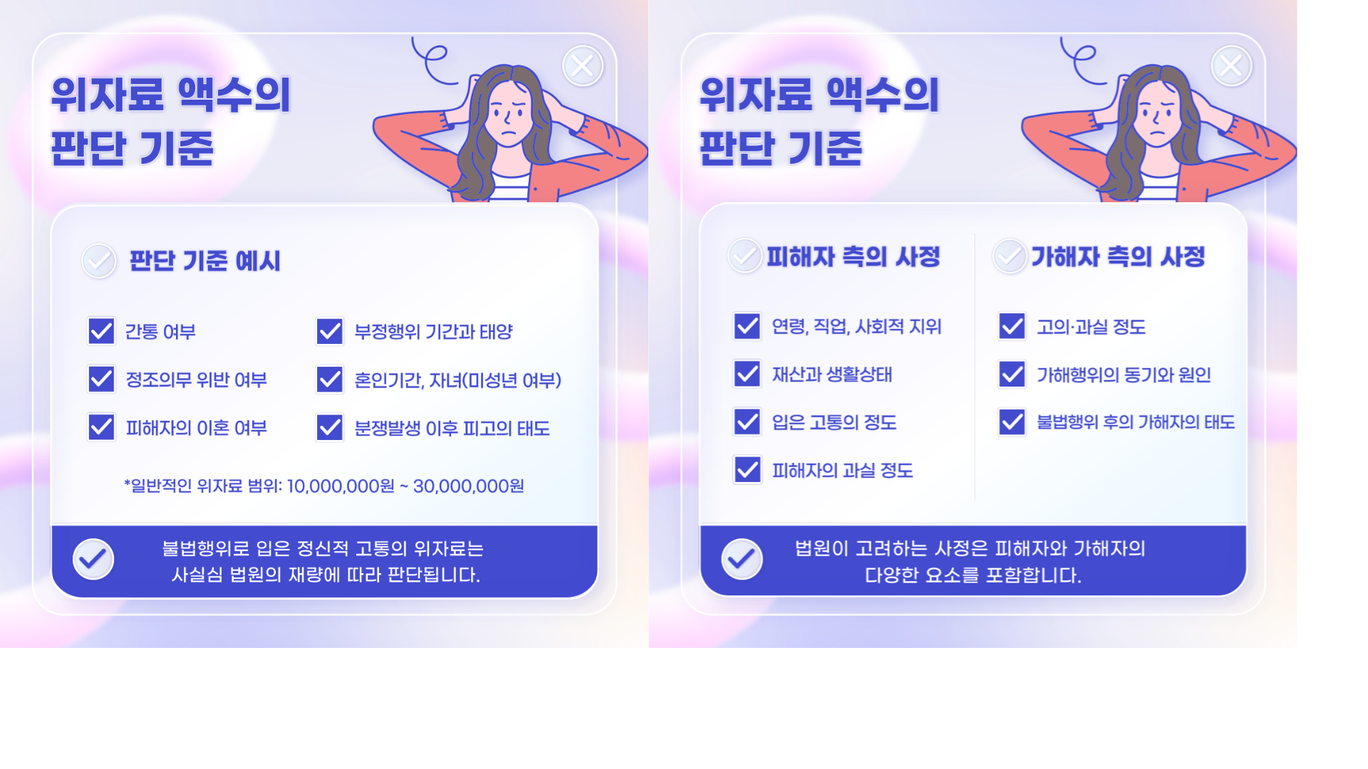 구체적으로 보면 혼인기간, 자녀(미성년 여부), 정조의무 위반인지, 간통까지 이르렀는지, 부정행위 기간과 태양, 피해자의 이혼여부, 분쟁발생이후 피고의 태도 등이 판단 기준이라 할 것입니다.