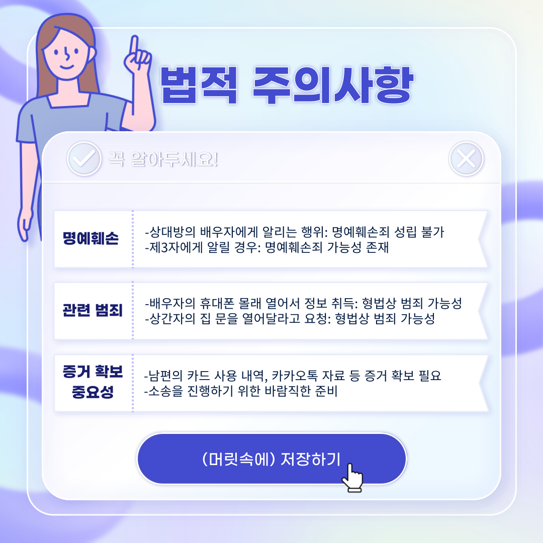 ◼︎ 배우자의 휴대폰을 몰래 열어서 취득한 카카오톡 대화 자료나 이메일을 열어보는 행위는 형법상 범죄가 성립할 수 있습니다. 상간자의 집에 가서 문을 두드리고 열러달라고 하는 행위도 역시 형법상 범죄에 해당할 수 있으니 주의하셔야 합니다.