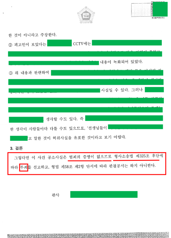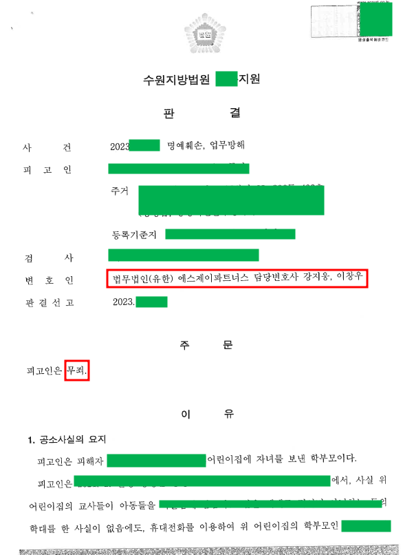 ‘어린이집 일부 교사들의 아동학대 정황에 대해 해당 어린이집 교사의 내부고발을 듣게 된 학부모(의뢰인)가 어린이집 CCTV를 확인하고, 그 내용을 이웃 학부모에게 공유한 사실을 어린이집 원장이 알게 되었고, 이러한 사실에 대해 이웃 학부모로부터 악의적인 내용의 사실확인서 등을 받아 이를 증거로 하여 의뢰인을 명예훼손, 업무방해 혐의로 고소하여, 이에 대해 수사한 수사기관에서 혐의가 인정된다고 보아 벌금 500만 원 구약식 처분을 한 상황에서 사건을 수임하여, 정식재판변호를 통해 의뢰인에 대한 무죄 판결을 받아낸 사례’