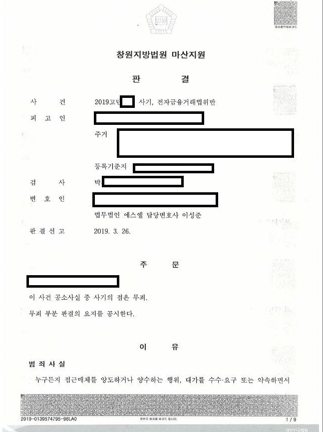 보이스피싱 관련하여 계좌를 모집한 혐의로 구속수사를 받게 된 의뢰인 측에서 저희를 찾아오시게 되었습니다. 피고인이 계좌를 모집하여 양도한 사실은 객관적으로 입증 되므로 전자금융거래법위반의 점은 인정하되 위 행위의 사기 관련성은 부인하였고 사기와 피고인 행위의 연관성이 없음을 입증하여 사기죄 부분은 무죄를 선고받게 되었습니다. 최근 보이스피싱 관련된 인출, 모집 범죄는 거의 징역형에 처해지고 있는데 저희 법무법인 에스엘은 무죄 판결을 이끌어 내었습니다.