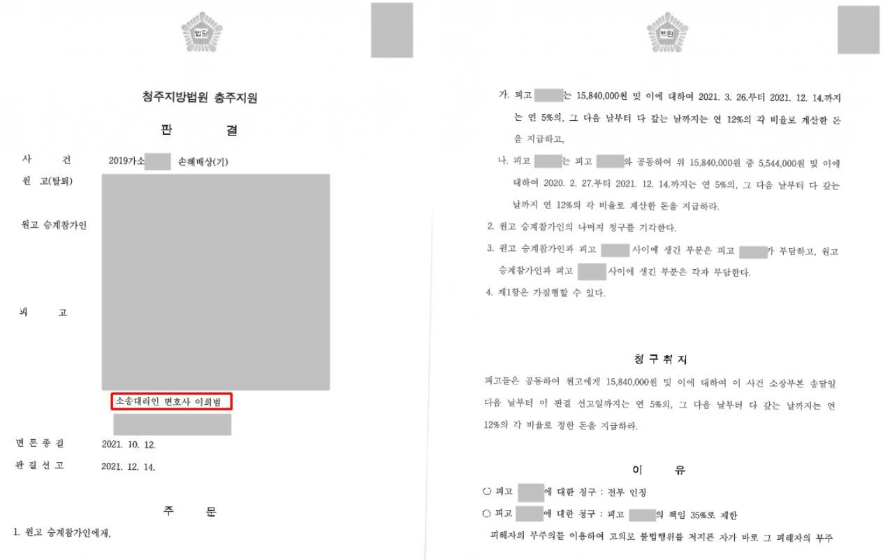 원고는 충청도 충주시에서 인력사무소를 운영하는 개인사업자이고, 피고는 원고를 전혀 모르던 자로서 피고의 남자친구가 원고에게 사기 범행을 저지르는 과정에서 피고가 원고에게 통화를 하게 되면서 원치 않게 사기범행에 연루되어버린 상황이었습니다. 원고는 이에 피고 및 피고의 남자친구 A 씨를 사기죄로 형사고소하면서 동시에 피고들을 상대로 자신을 기망하여 저지른 부분에 대하여 이는 불법행위이므로 피고들은 원고가 입은 손해에 대하여 금원을 지급할 의무가 있다며 피고와 남자친구를 상대로 공동불법행위에 의한 손해배상청구 소송을 제기하였습니다.