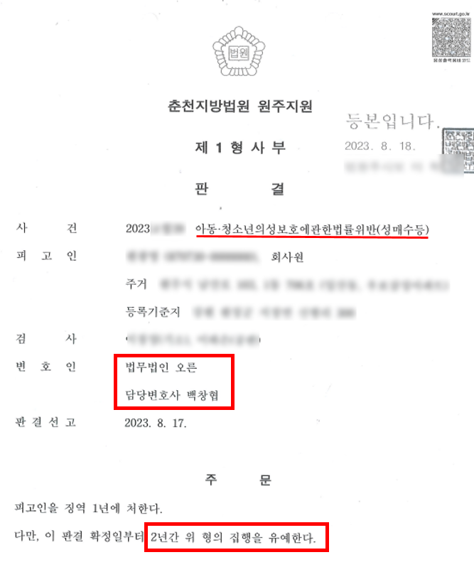 오늘은 법무법인 오른에서 실제로 집행유예로 해결해낸 아청법 성매수 사례를 하나 소개해 드릴까 합니다.