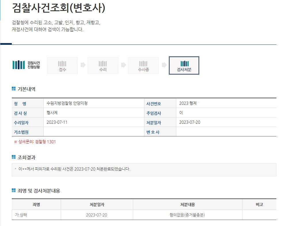 - 사건의 결론- 불기소 처분(혐의없음-증거불충분)