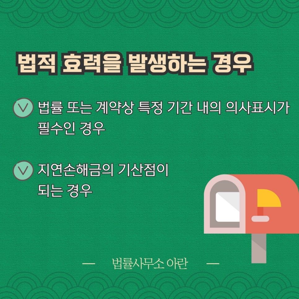 따라서 법률이나 계약에서 특정 기간 내의 의사표시를 요건으로 하고 있는 경우에는 내용증명의 도달 여부에 따라 소송의 성패가 크게 달라집니다. 따라서 이 때에는 반드시 상대방에게 내용증명을 보내 발신인의 의사를 확실하게 표시하여야 합니다.